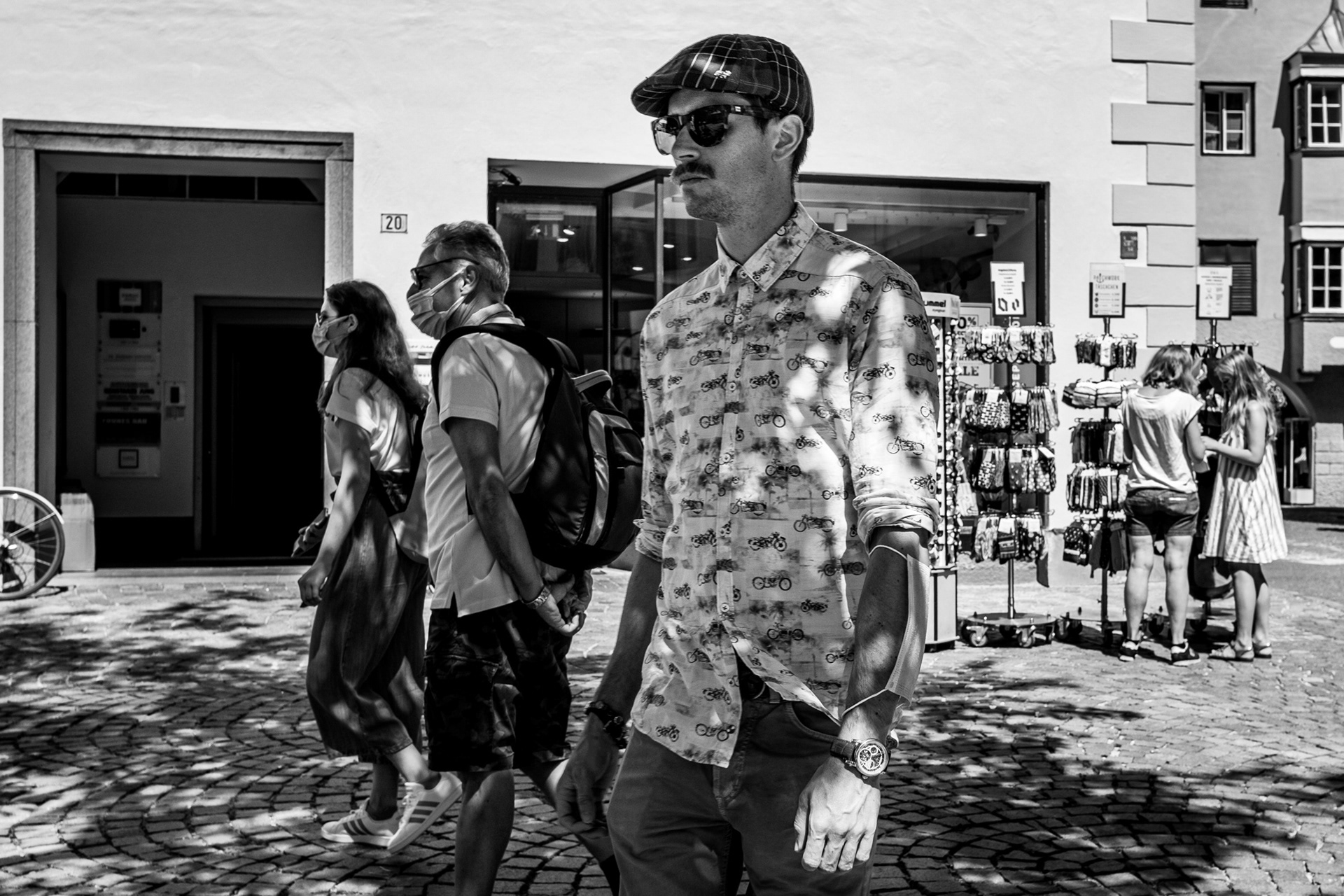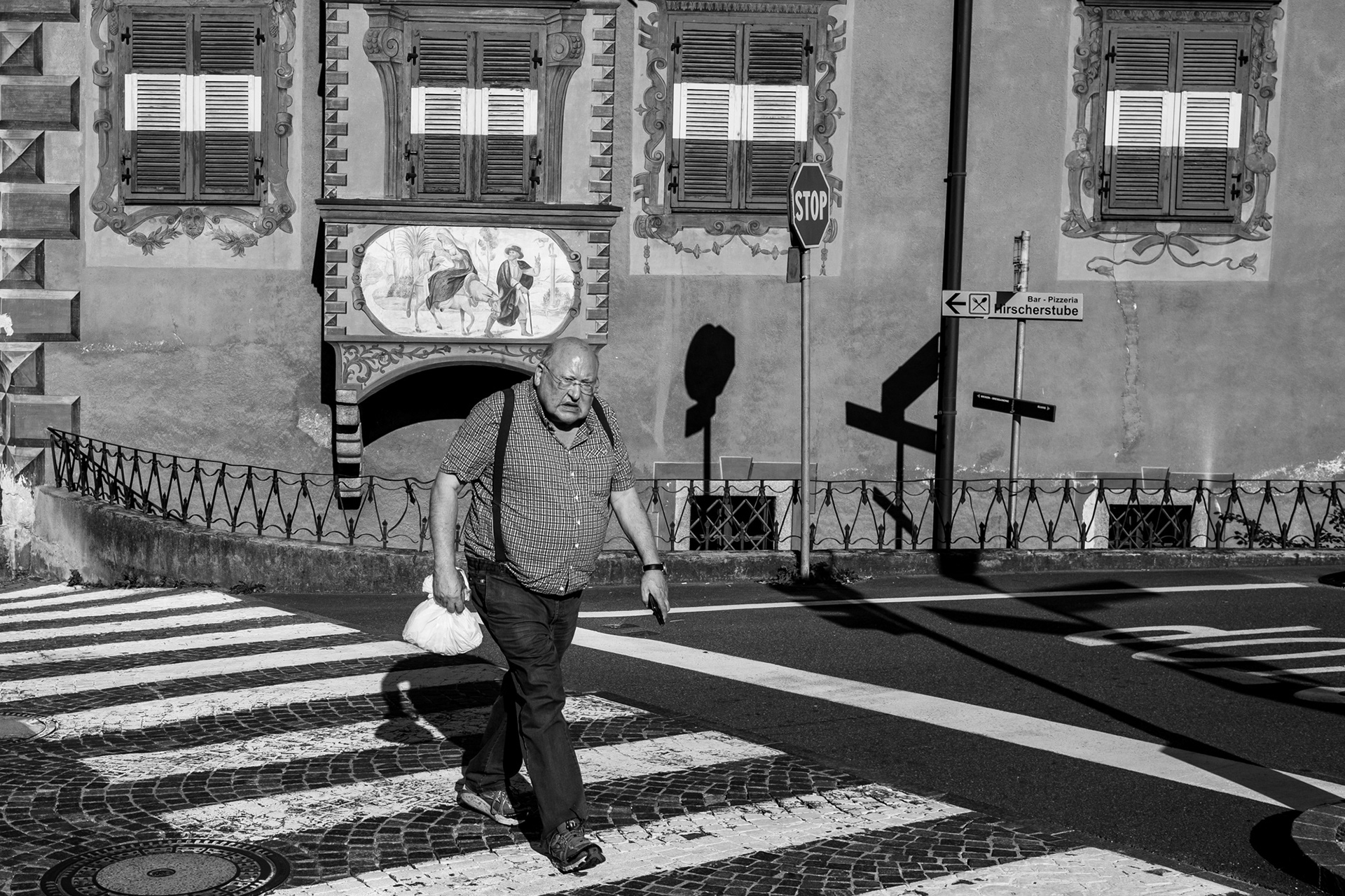 Besonders gefallen mir Bild 1, 3 und 8. Brixen hat mir gezeigt, dass Street Photography in Farbe super funktioniert. Ich persönlich werde mich nicht auf nur eines festlegen, denn dadurch würde ich mich nur selbst einschränken. Ich genieße die Möglichkeit sowohl Farbfotos zu produzieren, als auch Fotos in Schwarz-Weiß. Natürlich funktionieren für mich von diesen Farbfotos auch einige in Schwarz-Weiß, einige wiederum aber überhaupt nicht. Hier ein Beispiel aus den oben bereits gezeigten Fotos, dass sowohl Farbe als auch Schwarz-Weiß gut funktioniert: