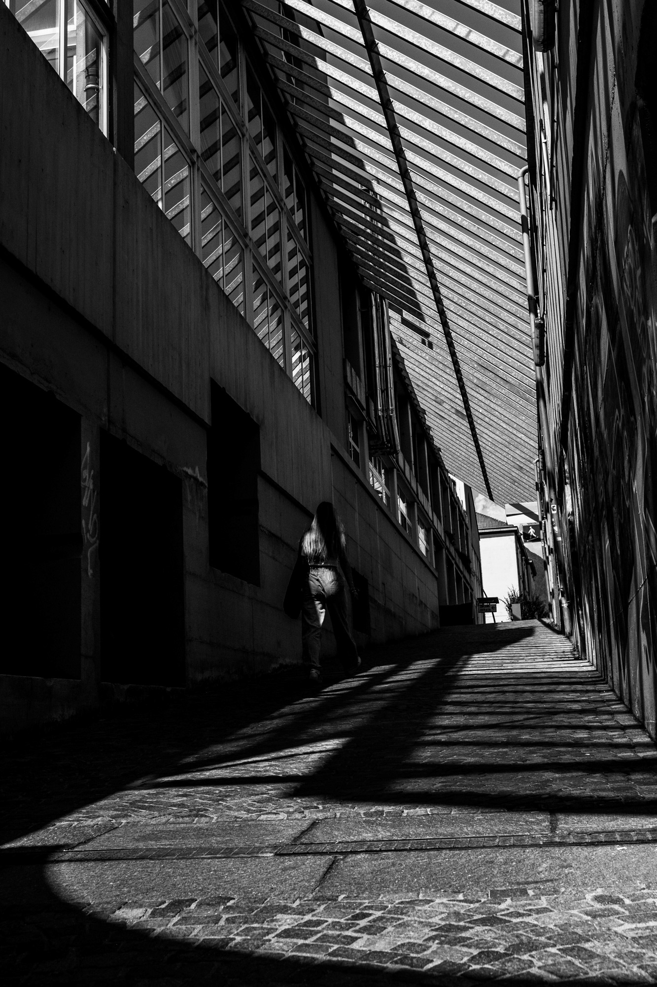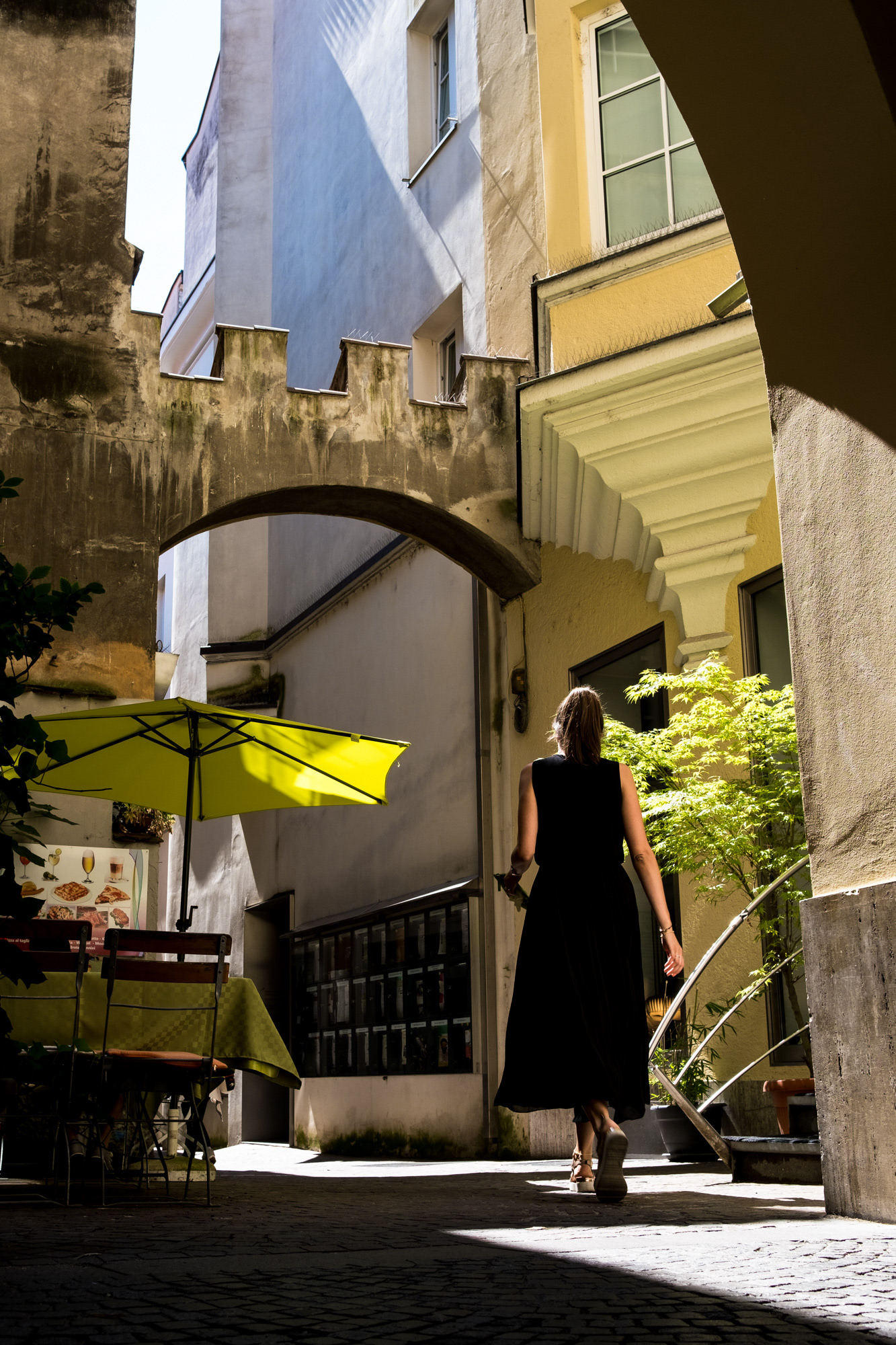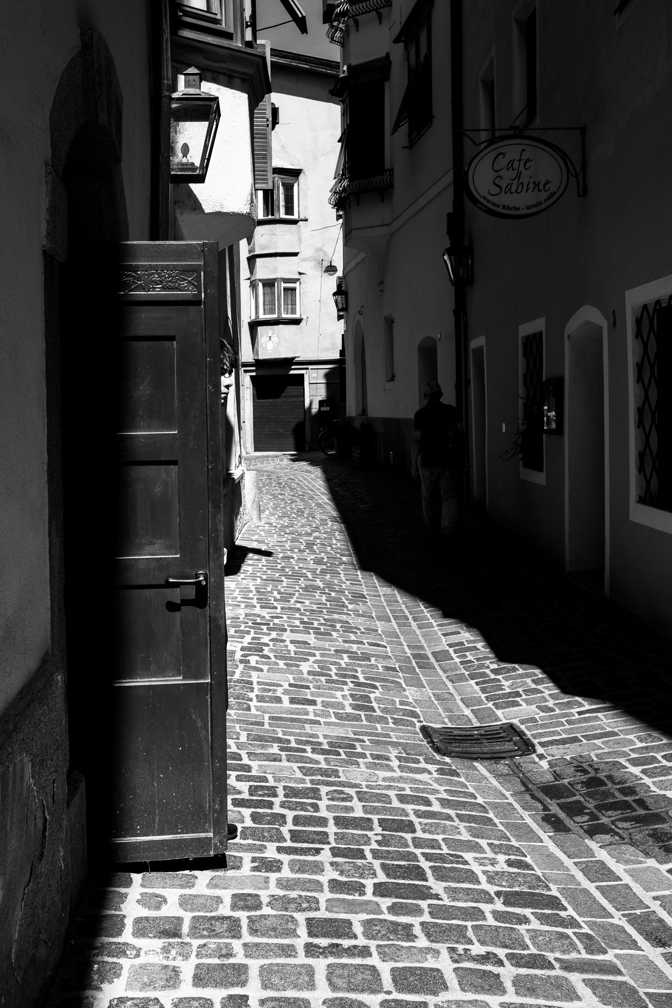 Wer meinen Blog verfolgt oder meine Posts auf Instagram, der weiß, dass ich eine große Vorliebe für schwarz-weiß Fotos mit Licht und Schatten habe. Auch sehr tiefe Schatten mag ich sehr gerne. In Brixen boten sich auf Grund der engen Gassen einige tolle Möglichkeiten an, meiner Vorliebe für diese Fotos nachgehen zu können. Hier half mir besonders die Tatsache, dass ich zu drei unterschiedlichen Tageszeiten jeweils in Brixen war. So konnte ich die Sonneneinstrahlung zu verschiedenen Uhrzeiten vor allem in den kleinen Gassen beobachten. Hierdurch entstanden immer andere Schattenbilder an den Gebäudefassaden oder auf dem Boden. Hier ein Beispiel vom selben Ort zu einer anderen Uhrzeit.