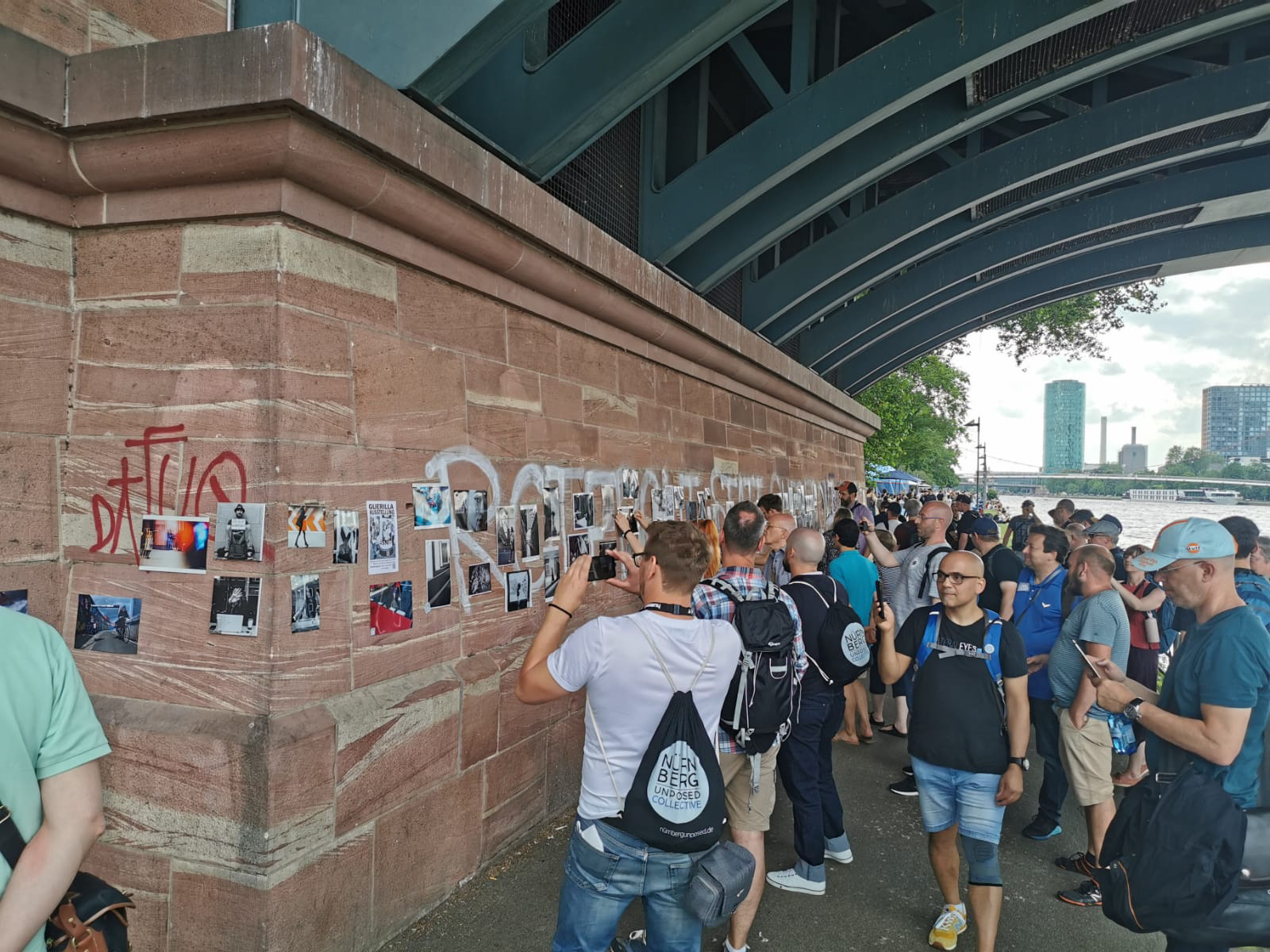 Natürlich wurde unterwegs mehr gequatscht als fotografiert. An der Alten Oper wurde sich dann wieder etwas neu vernetzt und der Weg führte dann durch die Innenstadt über den Main bis zur Untermainbrücke. Um 17 Uhr war der Treffpunkt auf dem Rasen direkt neben der Brücke. An diesem Ort gab es dann den absoluten Höhepunkt des Tages: eine Guerilla-Ausstellung von allen Teilnehmern. Im Vorfeld sollte jeder 2-4 Fotos in maximal 20x30cm ausgedruckt mitbringen. Mit diesen Fotos wurde an der Brückenfassade unterhalb der Brücke die Guerilla-Ausstellung von allen veranstaltet. Wir klebten unsere Fotos mit Powerstrips an die Brücke, setzten einige Hinweisschilder über den Sinn und Zweck dieser Aktion und waren mächtig stolz. Die Fußgänger*Innen die ab 18 Uhr vorbeikamen blieben sehr interessiert stehen.